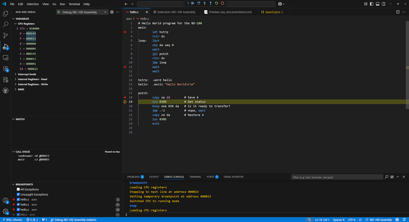 Screenshot of "Hello World" being debugged in Visual Studio code using the VS Code plugin, and relies on ND100x emulator and Ragge's ND assembler (asm)