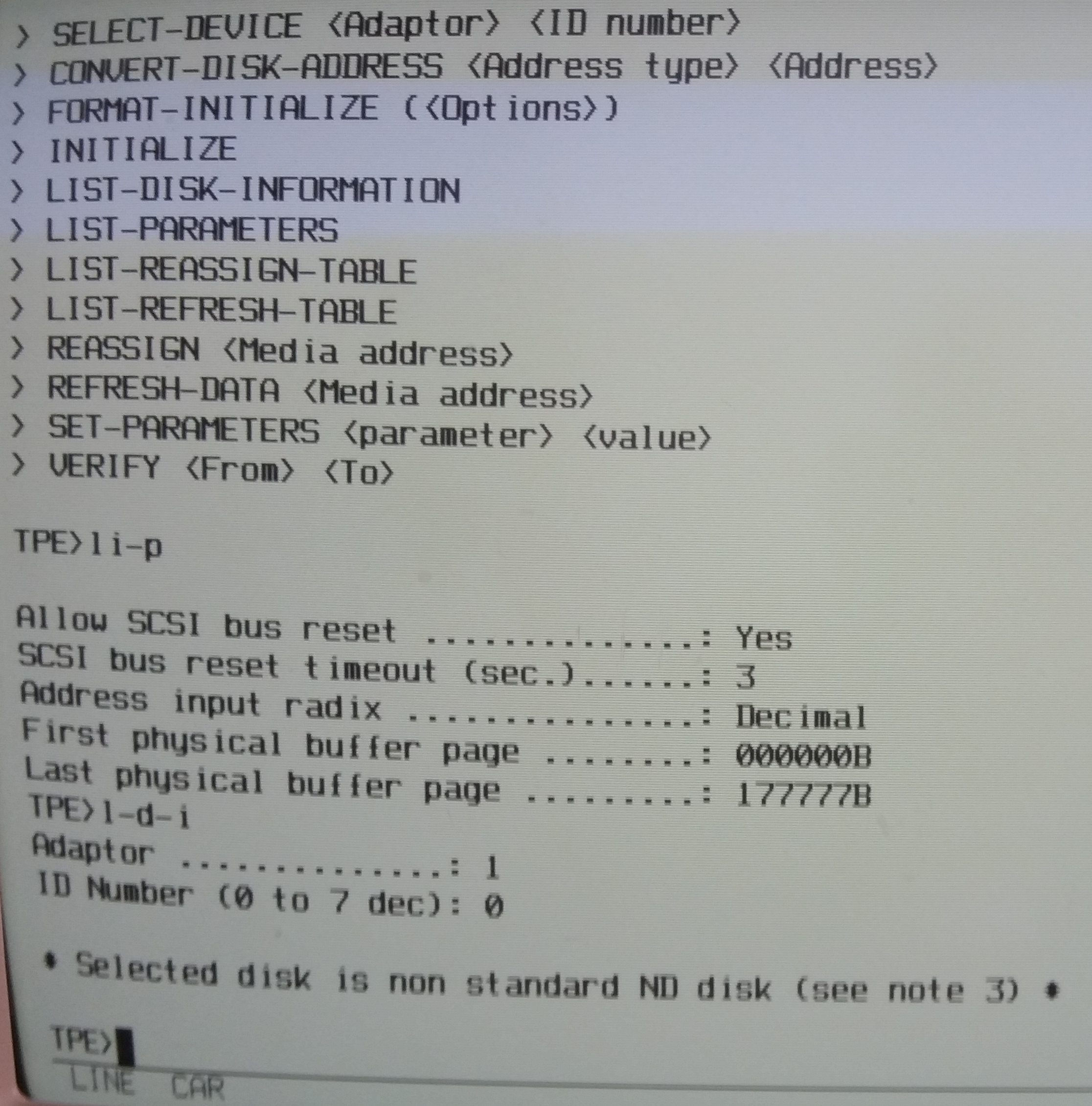 (Screenshot of the Disk Media Maintenance (DISK-MM-B00) program from ND-210523G. list parameters and disk information. Category:210523G02-XX-02D Category:ND-210523) |