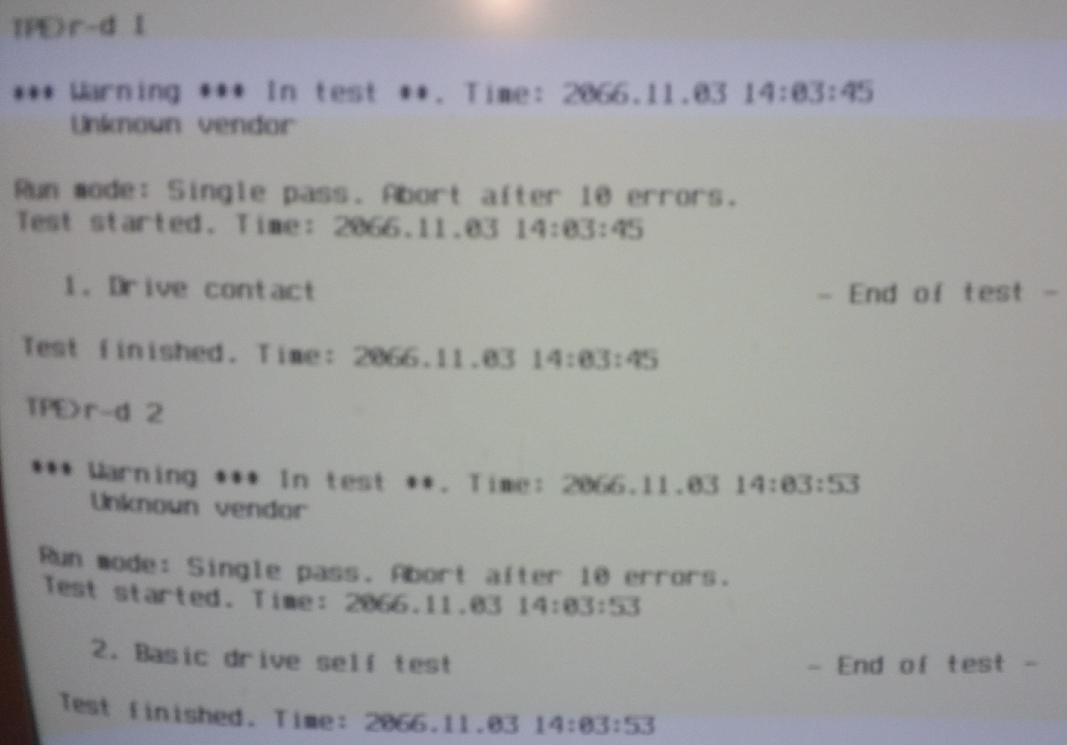 (Screenshot of SCSI-TV-B00 (SCSI Test and Verify) from ND-210523G, second floppy. Drive tests 1 and 2 run against the ST31200N drive. Category:210523G02-XX-02D Category:ND-210523) |