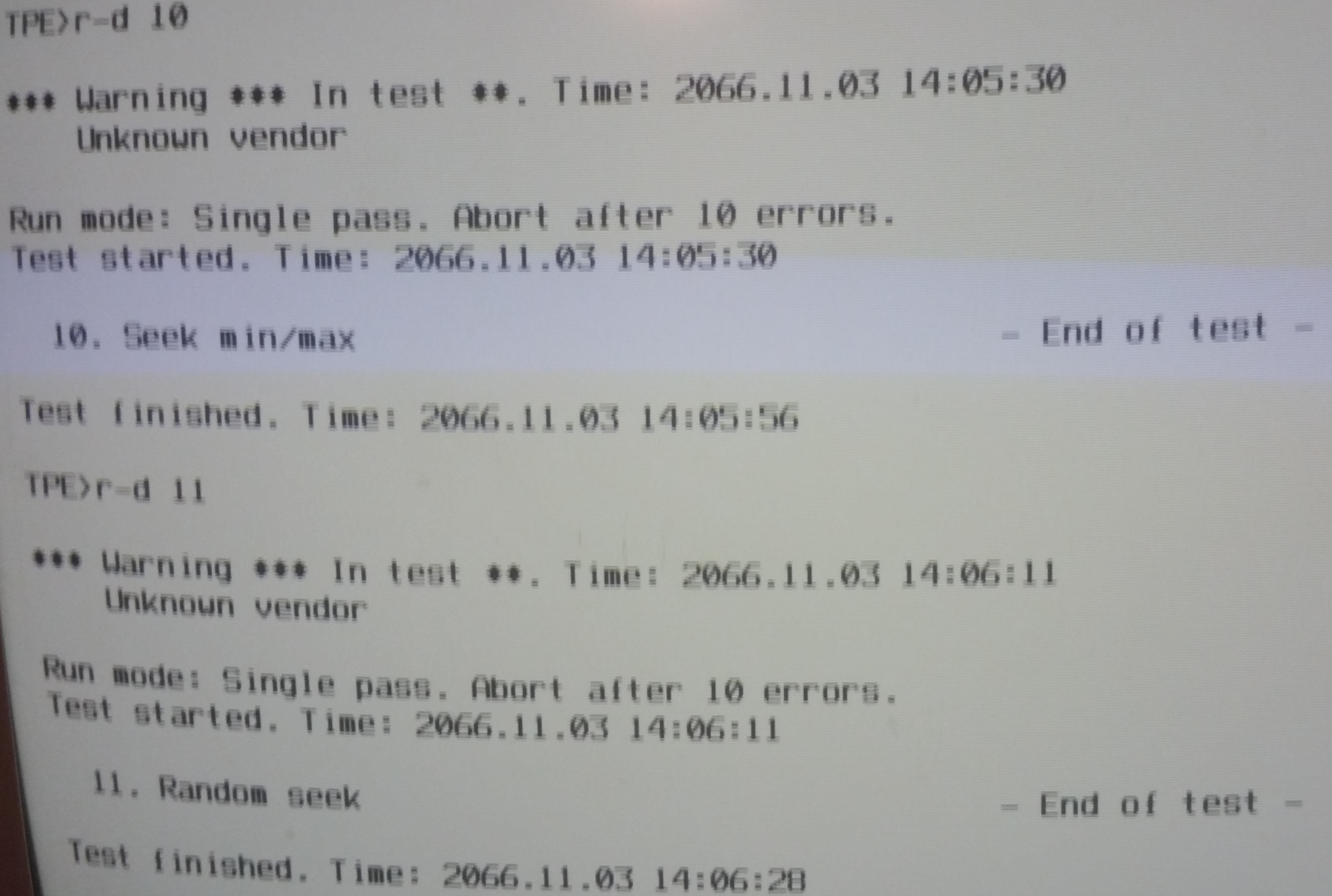 (Screenshot of SCSI-TV-B00 (SCSI Test and Verify) from ND-210523G, second floppy. Drive tests 10 and 11 run against the ST31200N drive. Category:210523G02-XX-02D Category:ND-210523) |