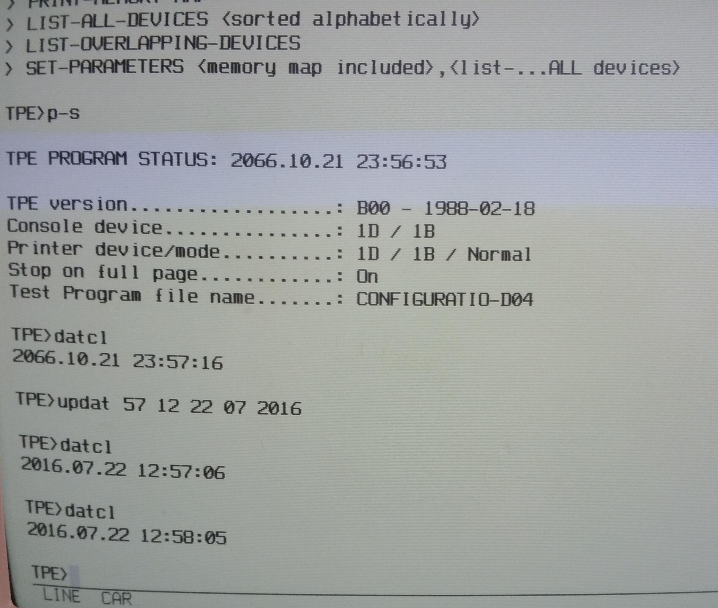 Screenshots from TPE Monitor, version B00. program-status command, plus updat and datcl showing that the panel clock updates and looks correct, but it just like to change to year 2066 anyway.