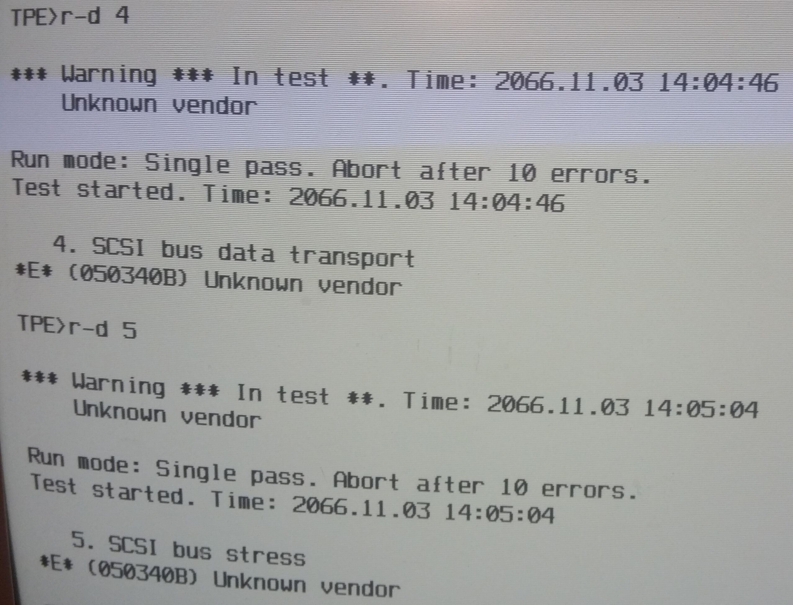 Screenshot of SCSI-TV-B00 (SCSI Test and Verify) from ND-210523G, second floppy. Picture shows that drive tests 4 and 5 refuses to run against the ST31200N drive because of "unknown vendor".