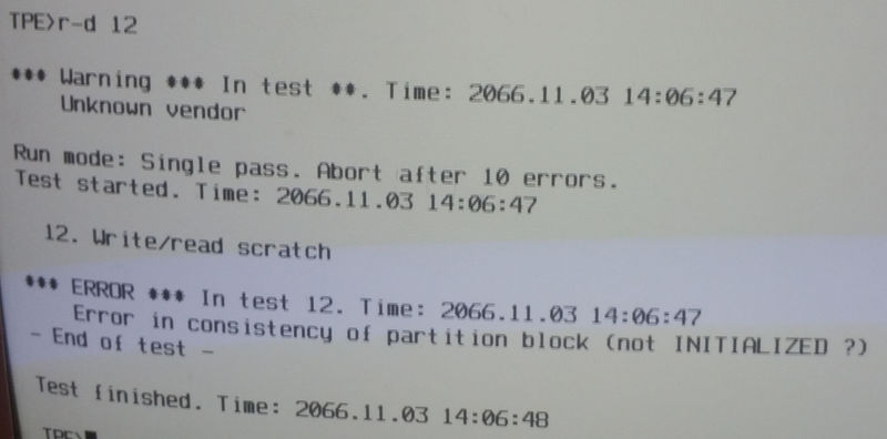 Screenshot of SCSI-TV-B00 (SCSI Test and Verify) from ND-210523G, second floppy. Drive test 12 fails when run against the ST31200N drive. Error messages is "Error in consistency of partition block (not INITIALIZED ?)".