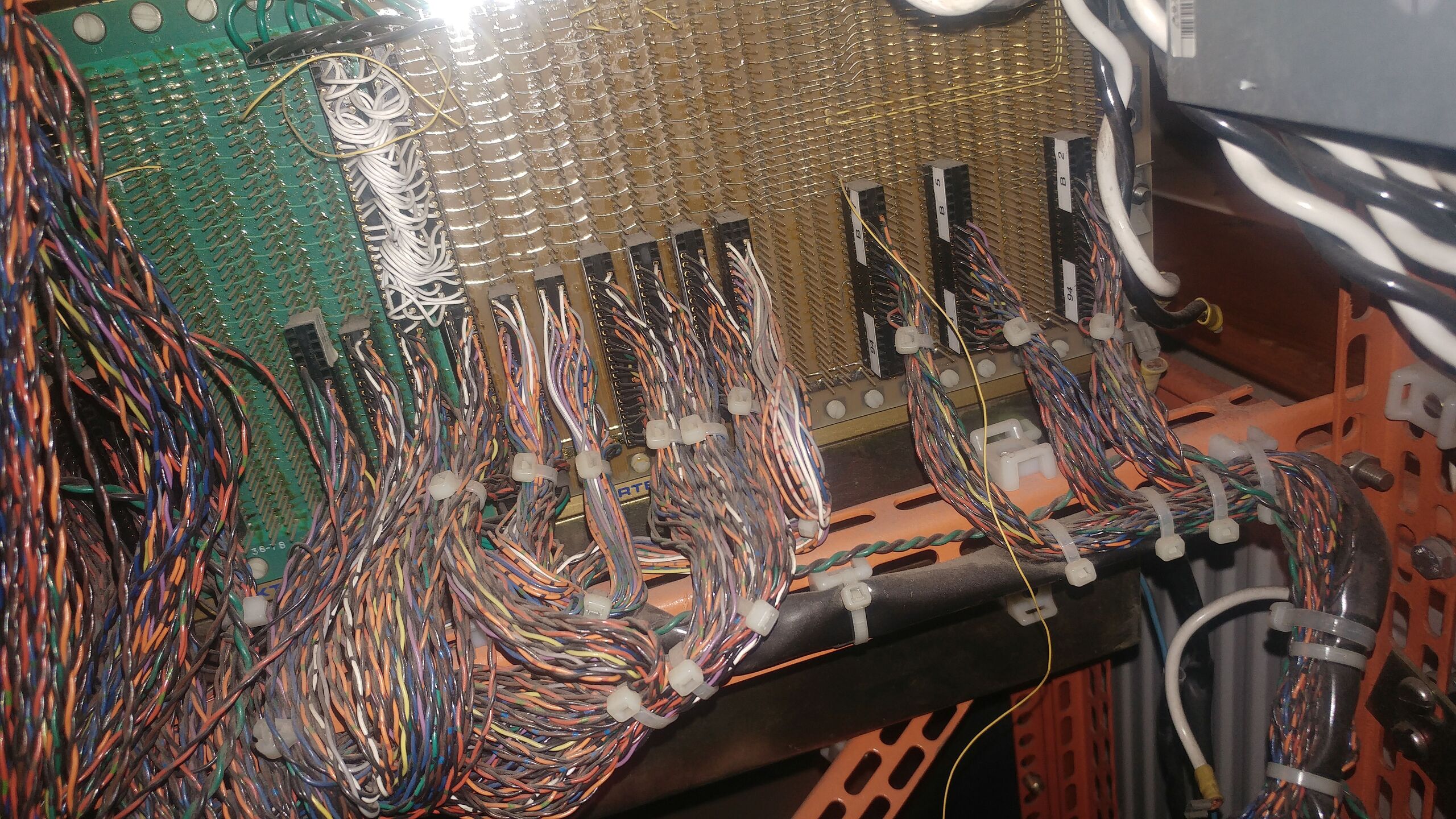 Backside of the I/O crate of NORD-10 snr 619. Colored cables connecting the I/O rack with the surrounding devices and the CPU and thick white and black are power. The backplane is split in two parts with the bus bridged with white cables attached via connectors, the power is bridged with the black and green cables, also in connectors.