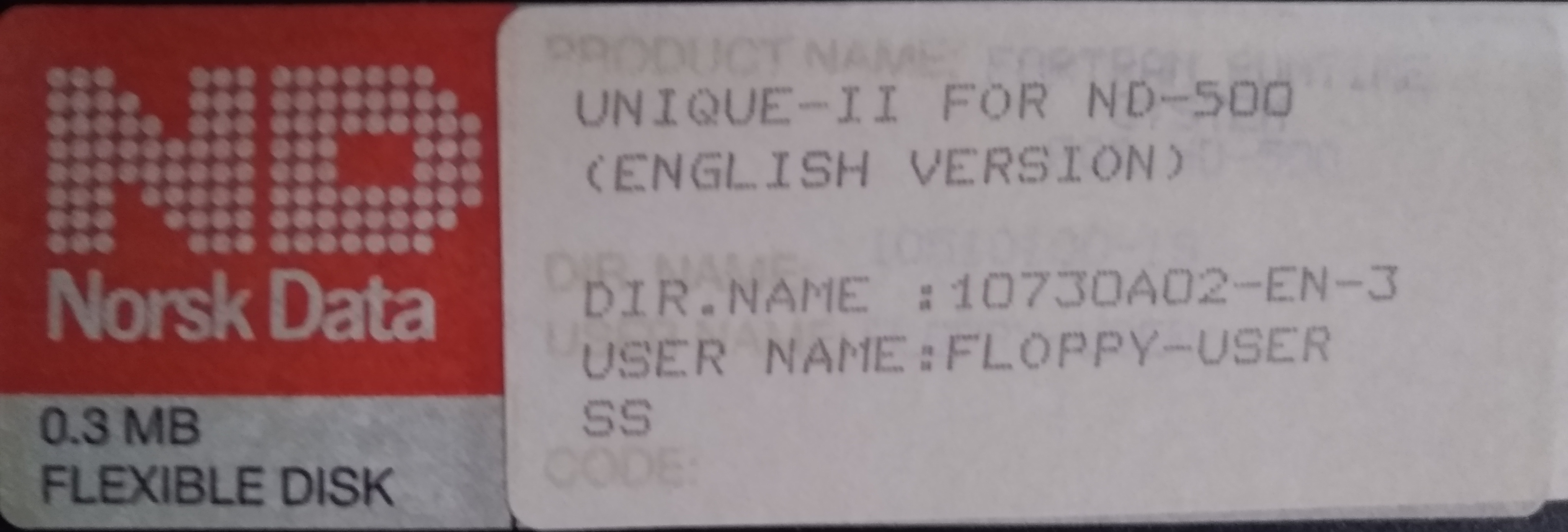Image of a 8 inch floppy label. Unique II for ND-500 (English version), floppy 3 of 3.