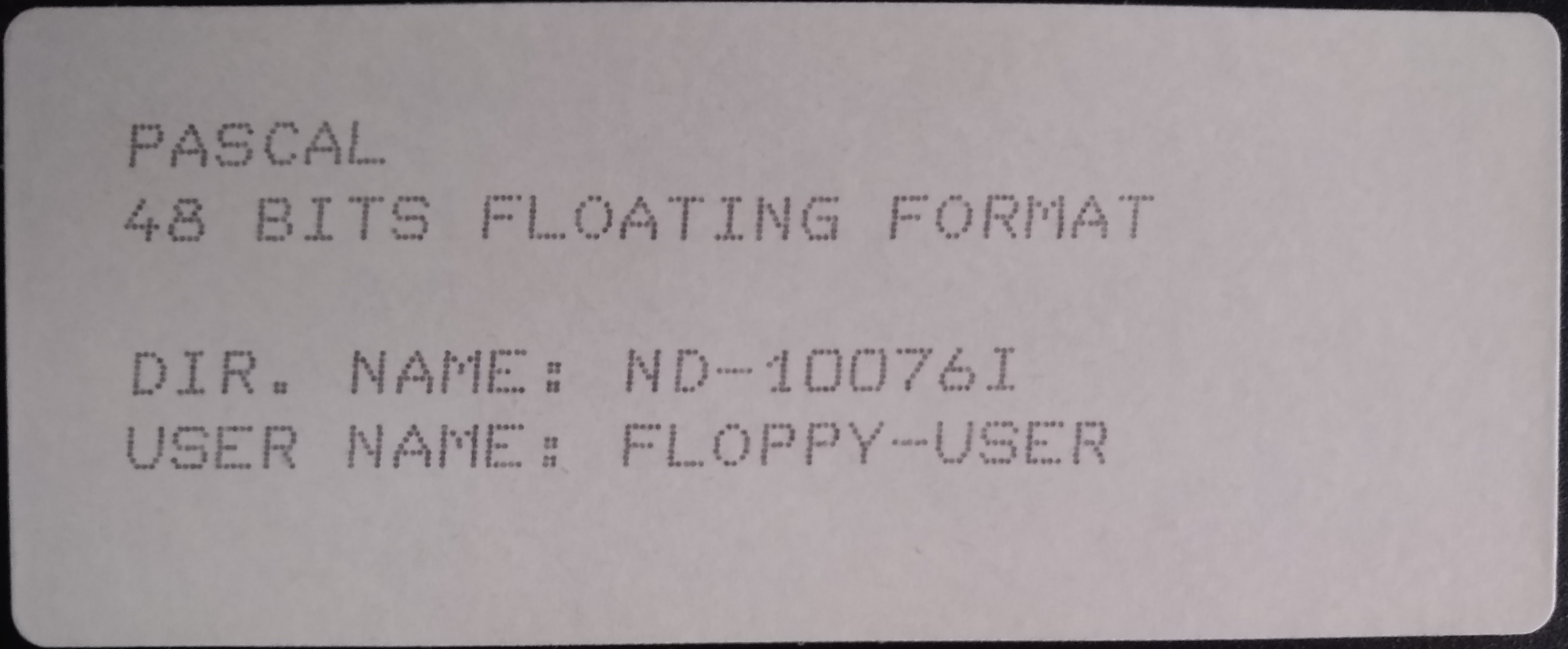 Image of a ND-10076I 8 inch floppy label. ND-10076I Pascal 48 bits floating format.
