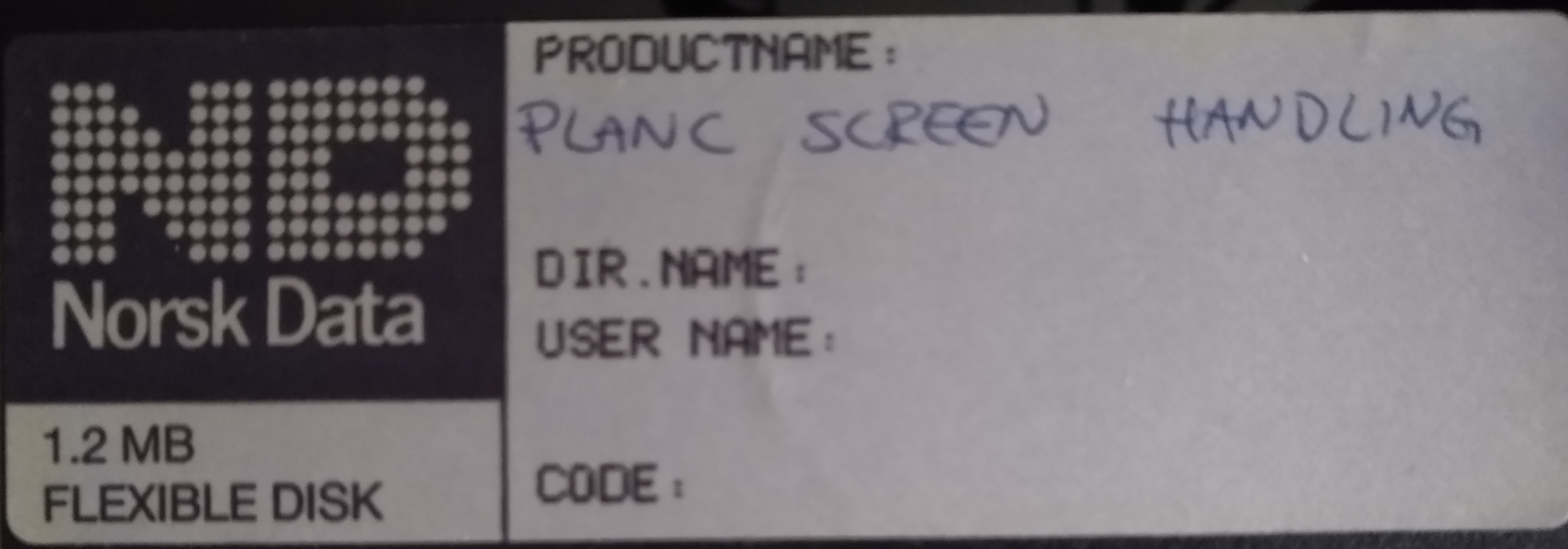 Image of a 8 inch floppy label. PLANC Screen Handling. Product number unknown at this time.