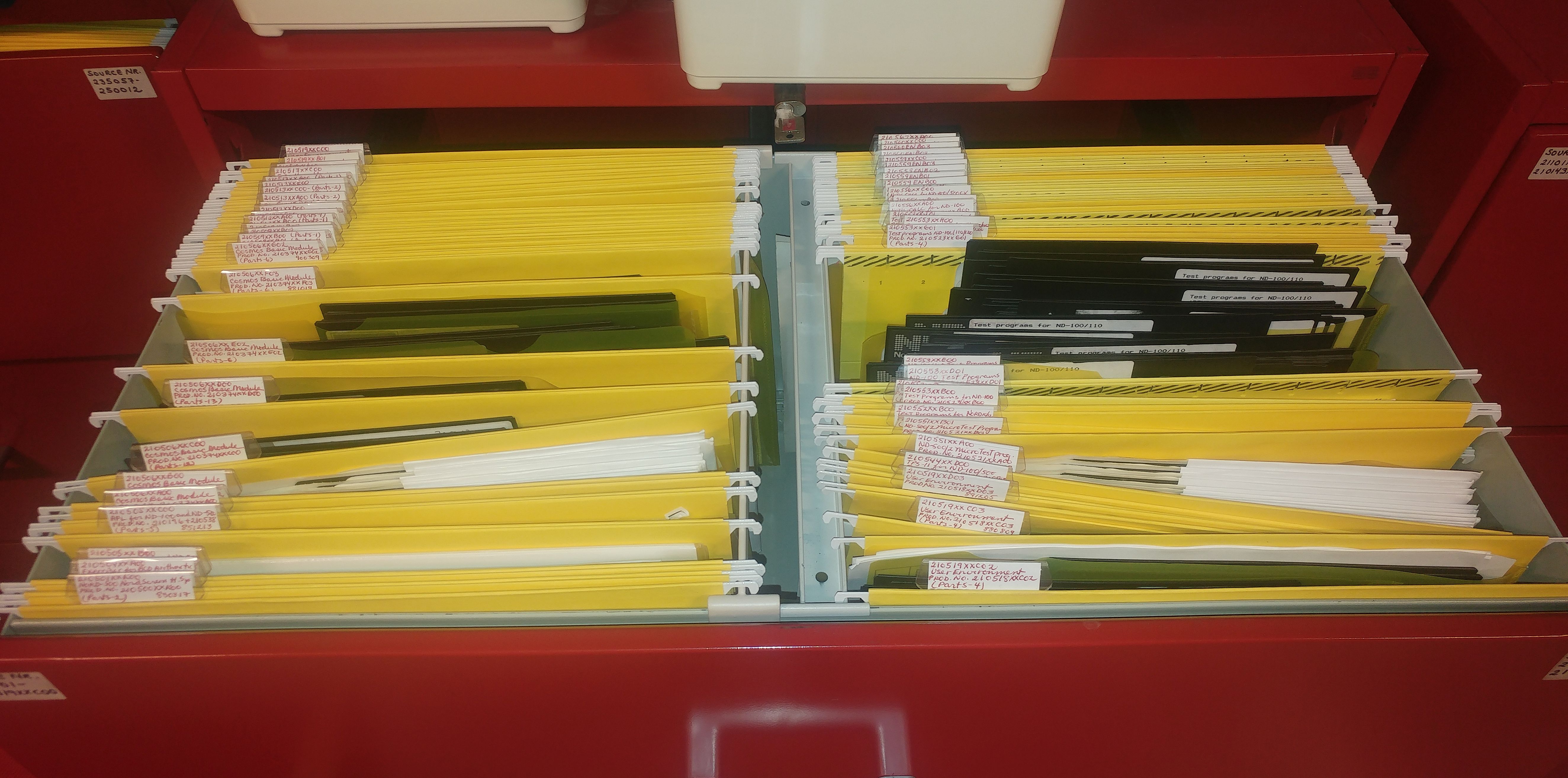 Looking into a drawer of the source code archive, mostly 8" floppies.